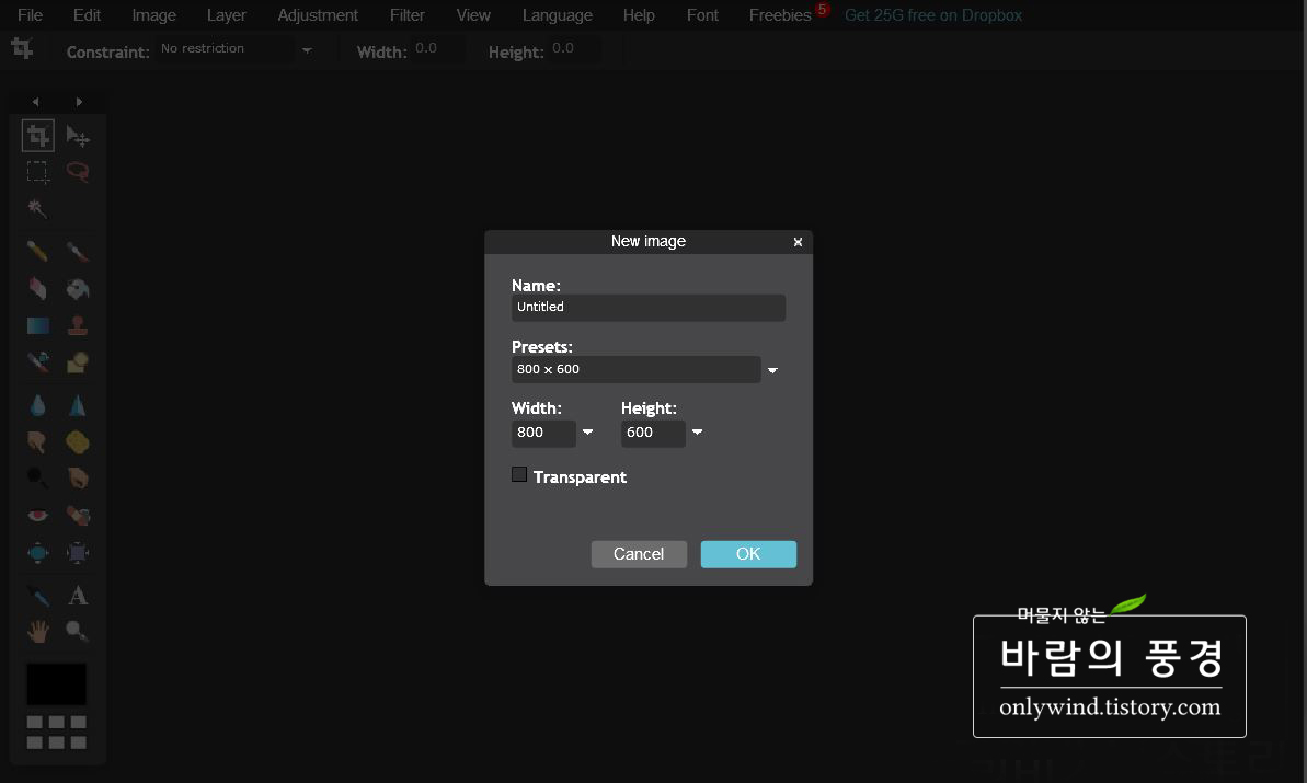 바람의 풍경은 CREATE A NEW IMAGE 새 이미지를 열고 접속했는데, 위처럼 지정된 새 이미지 사이즈가 뜨게 된다.