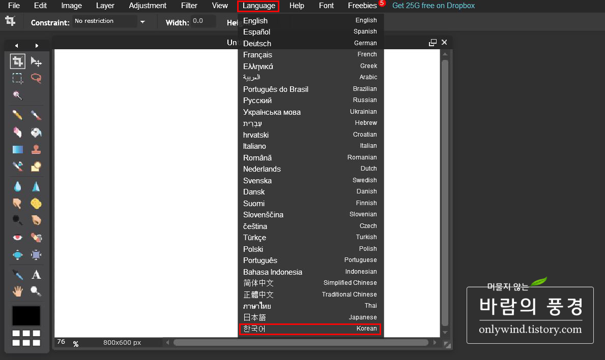 인터넷 포토샵 픽슬러 에디터는 영어를 기본으로 제공하기 때문에 사용하기 편하도록 언어를 한국어로 변경하여 사용하면 편리하다.