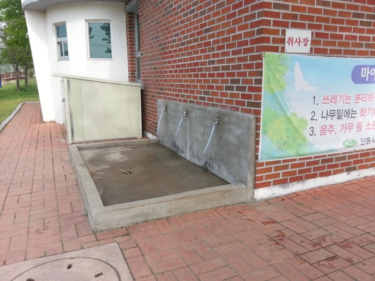화장실 뒤편엔 취사장 개수대가 있다. 캠핑장 인구가 급속도로 늘어나자 화장실 뒤편을 개조해 취사장으로 만든 흔적이 그대로 드러나 보인다.