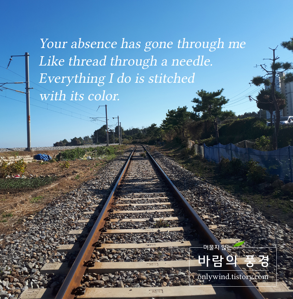 당신의 부재(不在)가 나를 관통하였습니다. 마치 바늘을 관통한 실처럼 내가 하는 모든 일이 그 실 색깔로 꿰매어집니다.