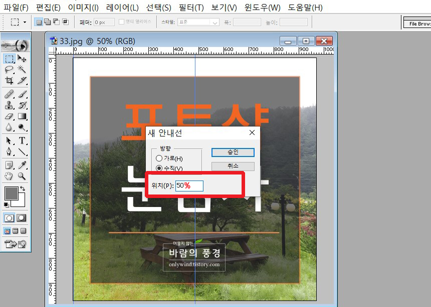 다음 설정창이 뜨면 0PX를 50%로 수정을 하고 승인을 누르면 세로 안내선이 중앙에 나타나게 된다.