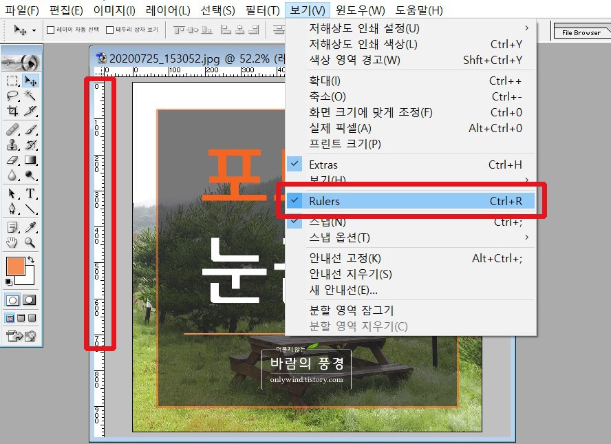 포토샵 상단 View(보기) → Rulers를 선택하면 좌측 이미지에 눈금자가 나타나게 된다. 더 빠른 방법으로 눈금자를 보이고자 할 때 눈금자 포토샵 단축키는 [ Ctrl ]+[ R ]을 동시에 누르면 된다. 눈금자 해제도 동일한 방법으로 하면 사라지게 된다.
