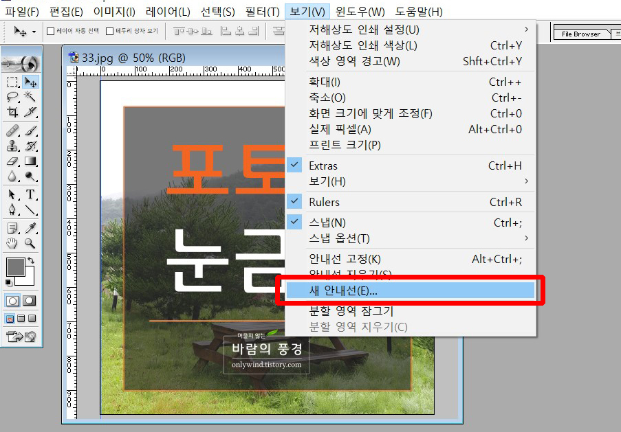 눈금자 설정 과정과 동일한 경로인 포토샵 상단 View(보기)에서 새 안내선을 클릭한다.