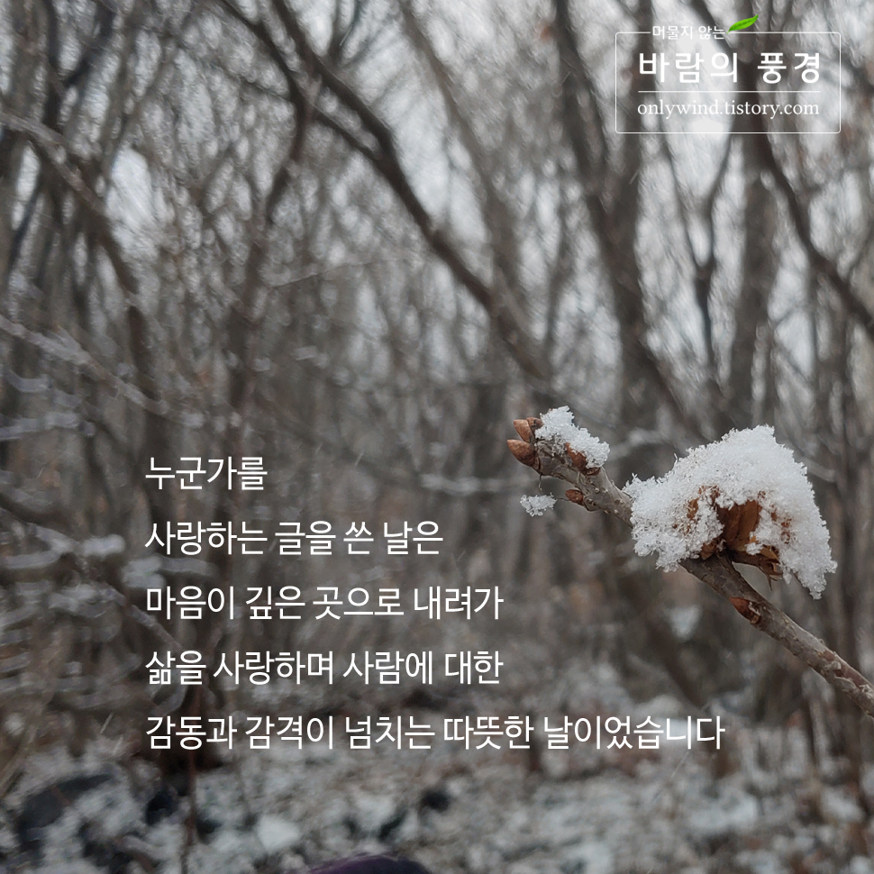 ▷ 누군가를 사랑하는 글을 쓴 날은 마음이 깊은 곳으로 내려가 삶을 사랑하며 사람에 대한 감동과 감격이 넘치는 따뜻한 날이었습니다.