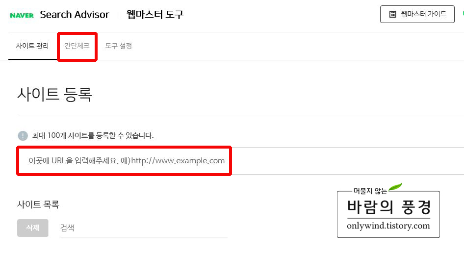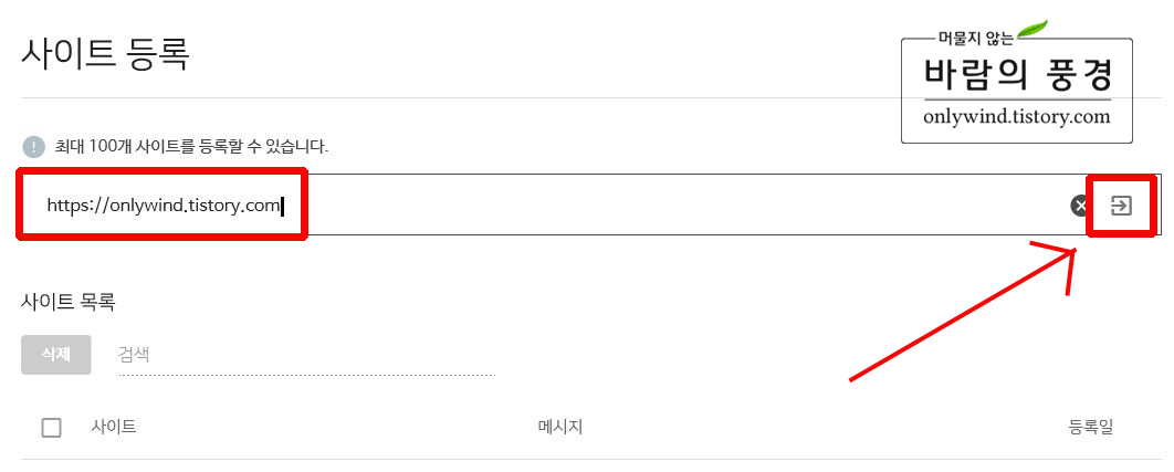 사이트 등록 창이 뜨면 주소창에 자신이 운영하는 블로그 주소를 입력해준다. 블로그 주소 입력이 끝났다면 우측 상단 화살표를 클릭한다. 화살표를 클릭하지 않고 키보드 'enter'를 눌러서 등록을 진행해도 된다.