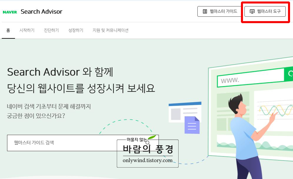 네이버 로그인을 하였다면 서치어드바이저(Search Advisor) 우측 상단 '웹마스터 도구'를 통하여 티스토리 네이버 등록을 시작한다.