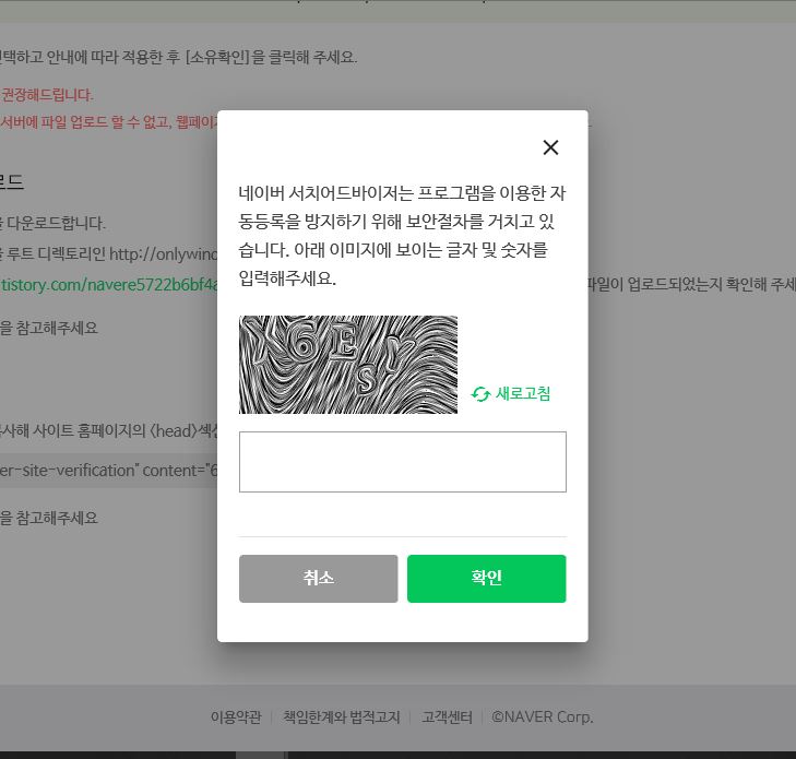 티스토리 관리자 설정 모드에서 메타 태그 적용이 모두 완료 되었다면, 다시 네이버 서치어드바이저로 돌아와서 하단 '소유확인'을 눌러준다. 티스토리 블로그 소유확인은 네이버 서치어드바이저 자동등록 방지를 위해 보안코드를 입력해야만 한다.