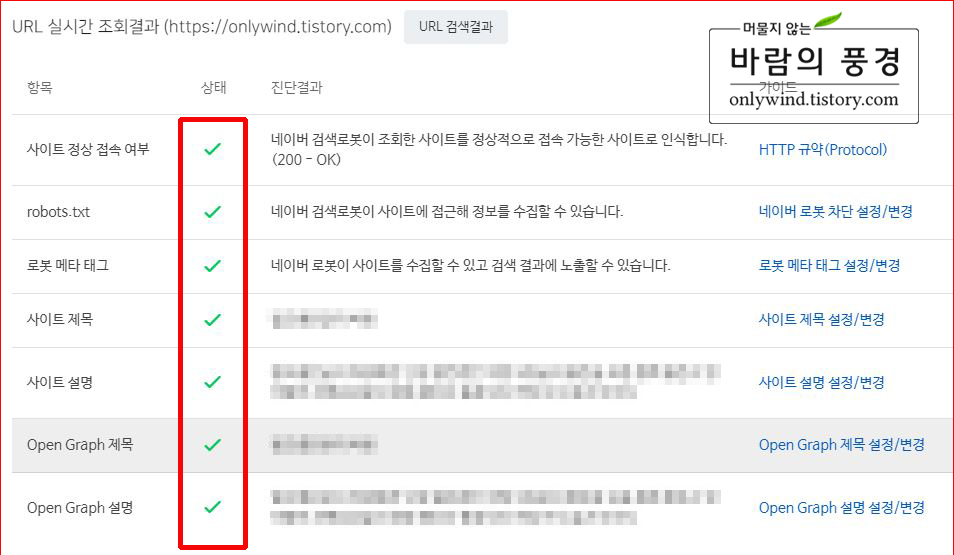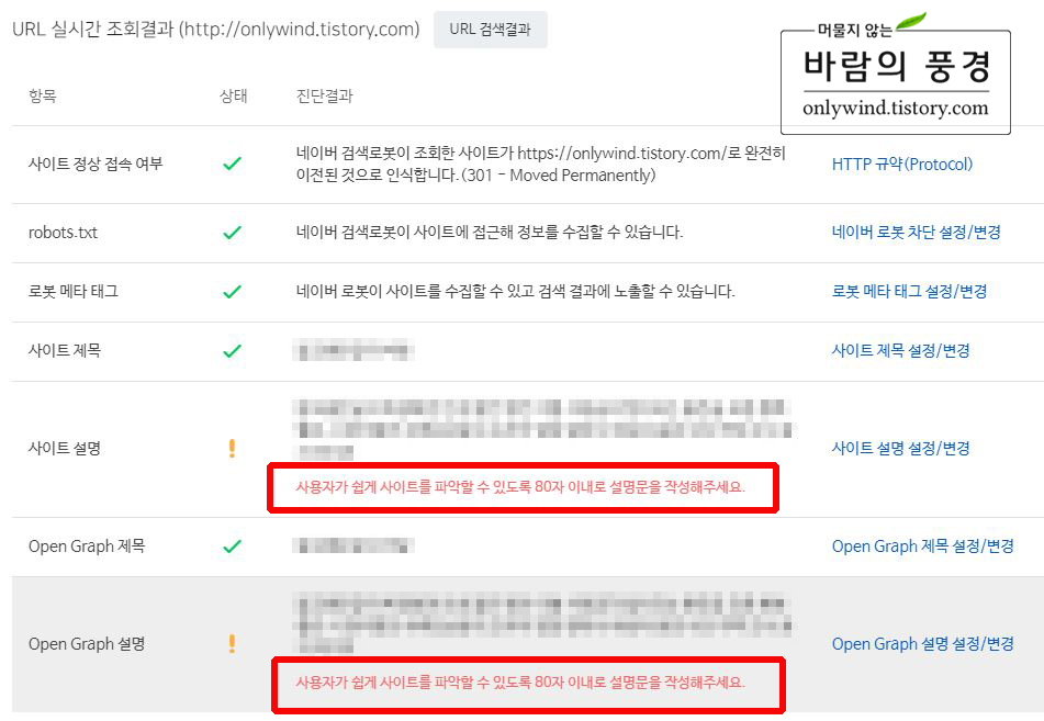 검색 노출에 불이익을 받는다거나 스팸성 블로그로 낙인 찍히지 않기 위해서는 정해진 기준을 다르는 것이 원칙이다. 설명문구를 80자 이내로 줄였더니 진단결과 모두 정상으로 나타난다.