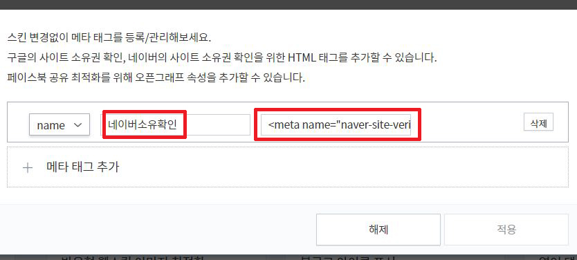 name옆 빈칸에는 자신이 적고자 하는 소유 이름을 적고, 우측 마지막 빈칸에는 서치어드바이저에서 복사한 메타 태그를 입력하고 적용을 누르면 된다.