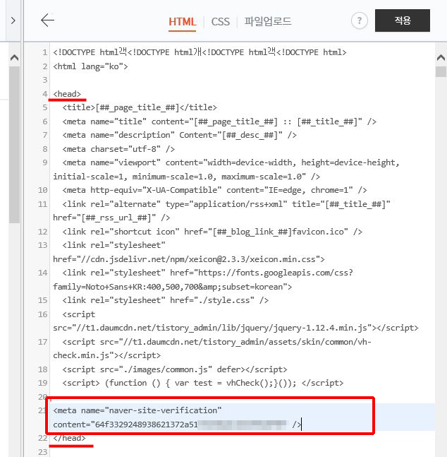 복사한 HTML 태그를 티스토리 블로그 설정 관리자 모드 '스킨 편집' →' html 편집'으로 들어가서 <head>, </head> 섹션 사이에 복사해 두었던 HTML 메타 태그를 붙여 넣기 한 다음 우측 상단 '적용'을 눌러주는 방식으로 어렵게 진행 했었다.