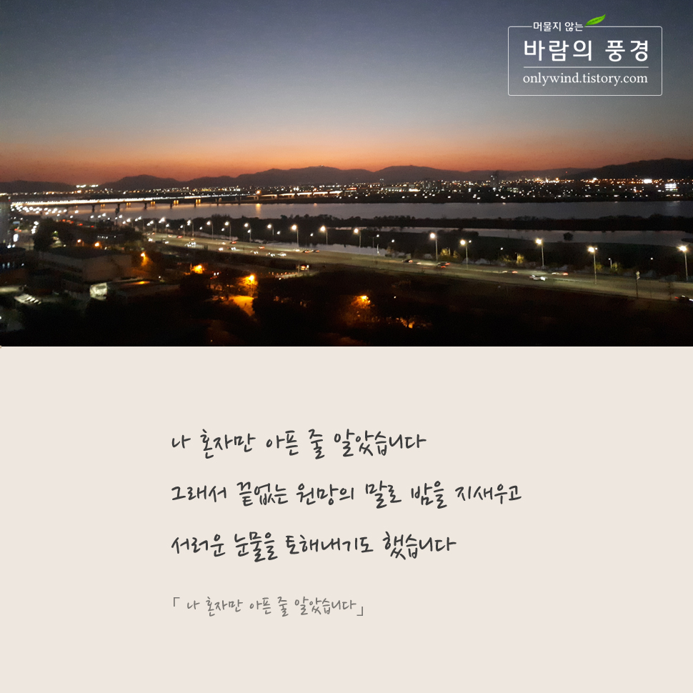 ▷나 혼자만 아픈 줄 알았습니다. 그래서 끝없는 원망의 말로 밤을 지새우고 서러운 눈물을 토해내기도 했습니다