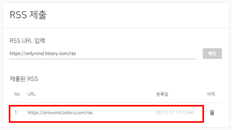 보안코드를 정확히 입력하고 나면 티스토리 블로그 RSS 등록 날짜와 함께 블로그 주소가 나타난다.