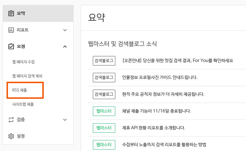 서치어드바이저 제일 하단에 등록 완료된 목록 사이트 주소를 클릭하면 설정 페이지가 뜬다. 좌측 요청 탭을 열어보면 티스토리 블로그 RSS 제출 메뉴가 보인다.