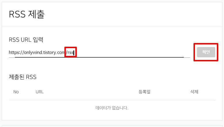티스토리 RSS 제출에서 자신의 블로그 주소 맨 끝에 RSS만 추가해서 입력한 후 확인