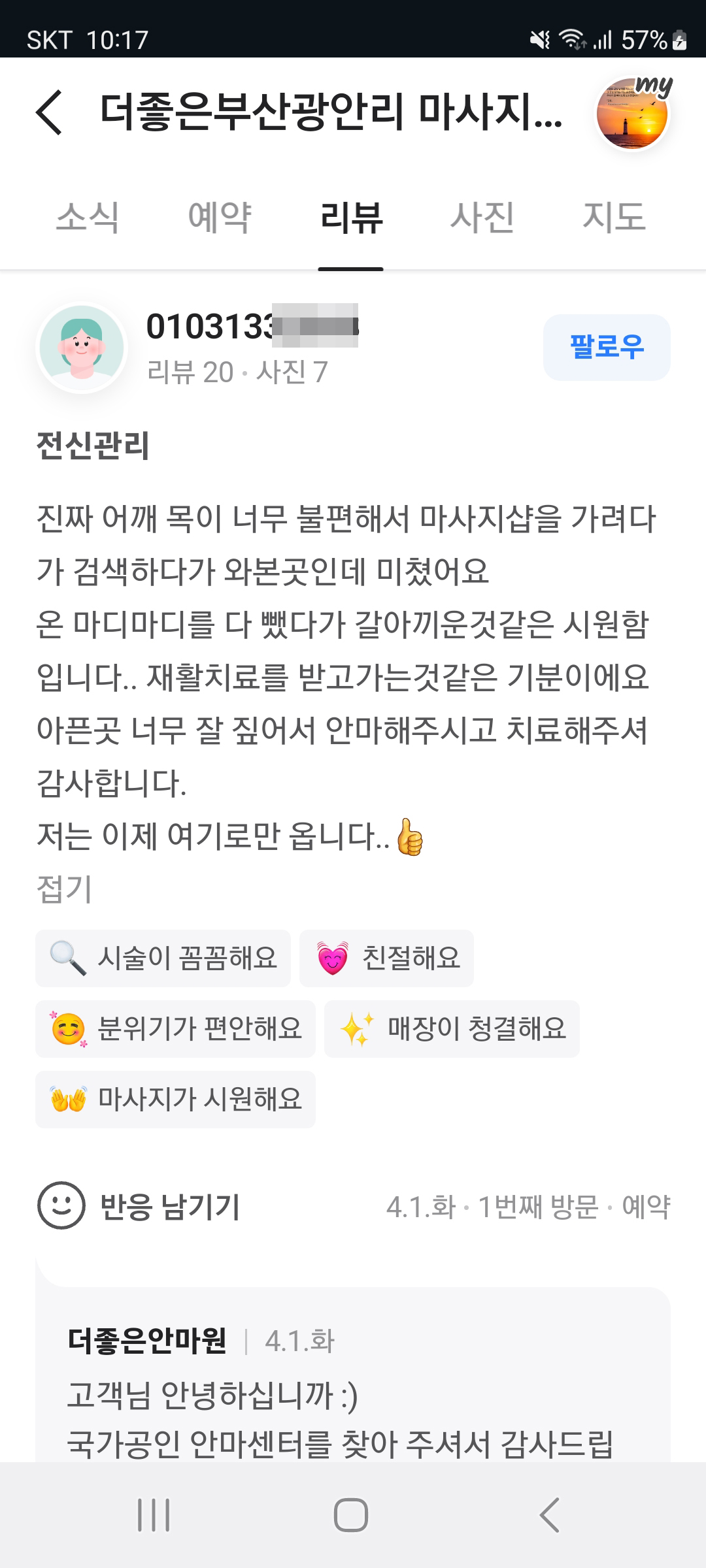 경험과 실력이 뛰어난 국가공인 안마사 선생님들이 최고의 서비스를 제공하고 있으니 리뷰 또한 극찬이 넘치는 결과로 나타나는것 같다.